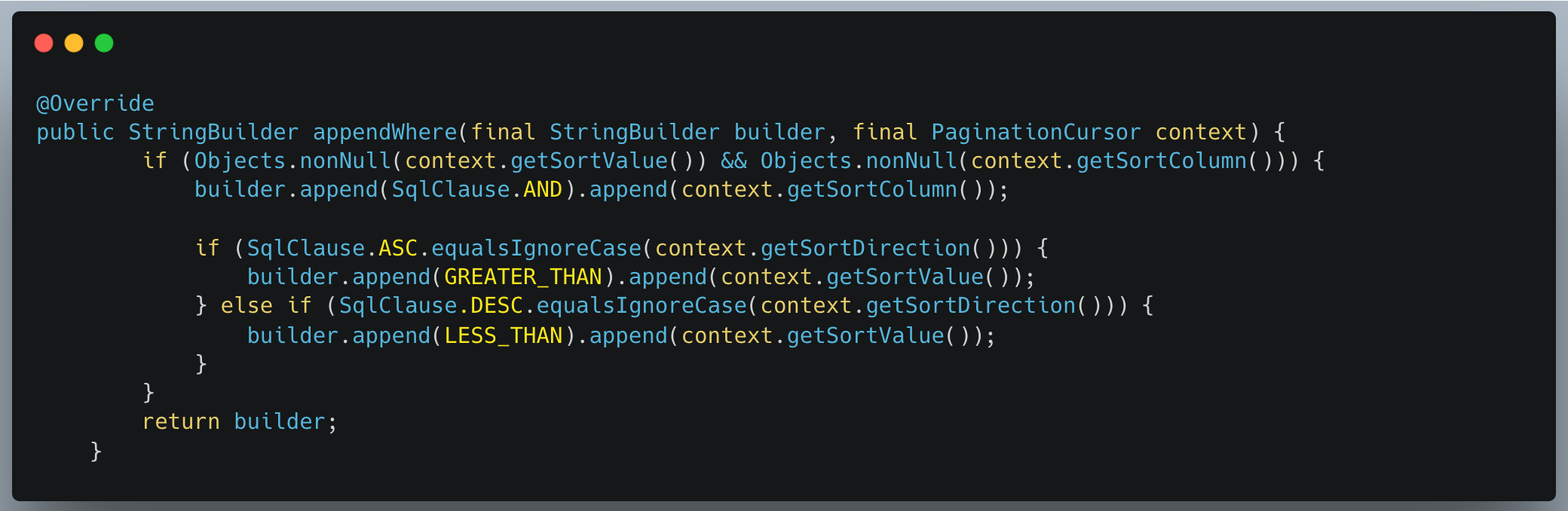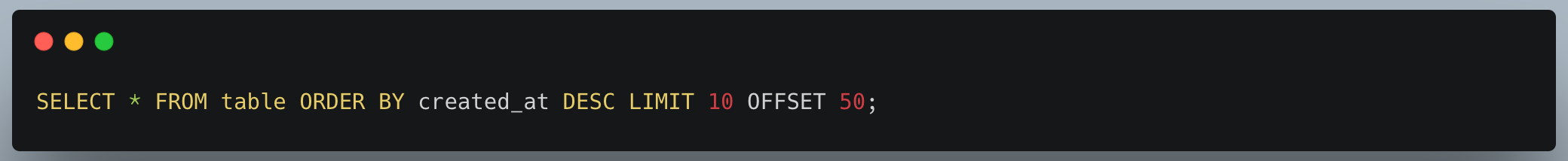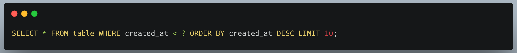 Here, created_at acts as the cursor — only rows after the given value are returned. This makes the query index-friendly and consistent even if new rows are inserted during pagination.