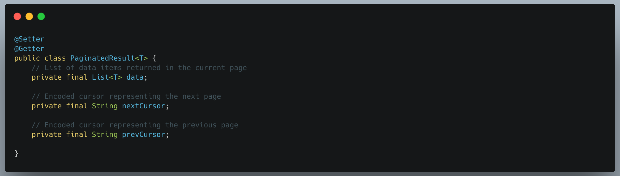 WHERE clause in KeysetBasedPaginationStrategy- PaginatedResult: To support cursor-based navigation in both directions, the paginated query result is wrapped in a PaginatedResult<T> class rather than returning just a list.This wrapper includes: data, nextCursor and prevCursor.