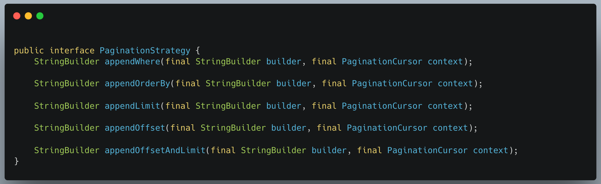 - Core Interface: All pagination strategies implement a common interface that defines methods for generating SQL fragments like