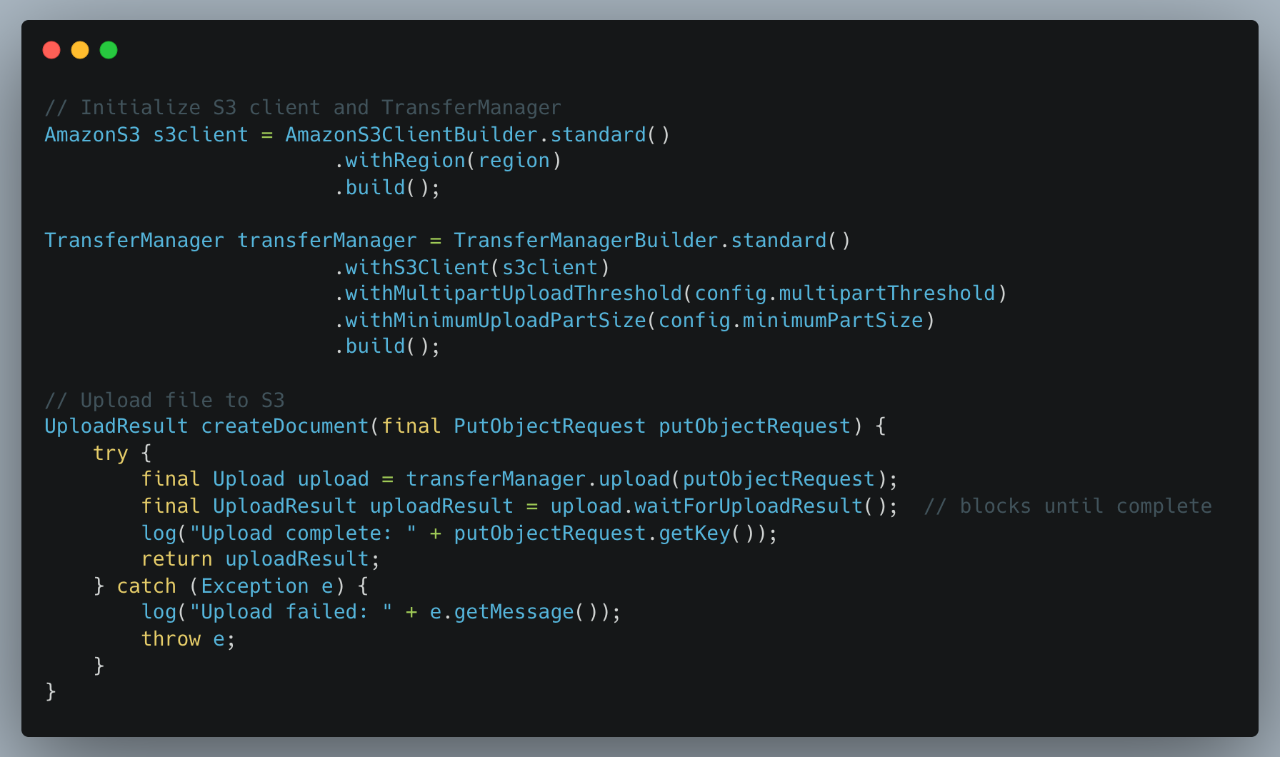 - Simplicity: No need to manually manage file splits, threads, or retry logic — TransferManager handles it.