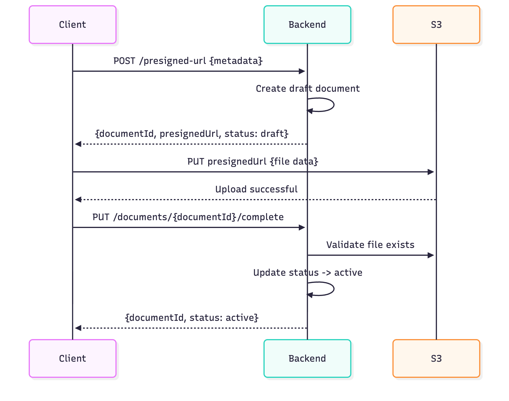 - Post-Upload Status Check: After the upload completes, the backend validates that the file exists in S3 and matches the expected metadata before marking the document as active. This prevents incomplete or failed uploads from being treated as successful and ensures a consistent system state.