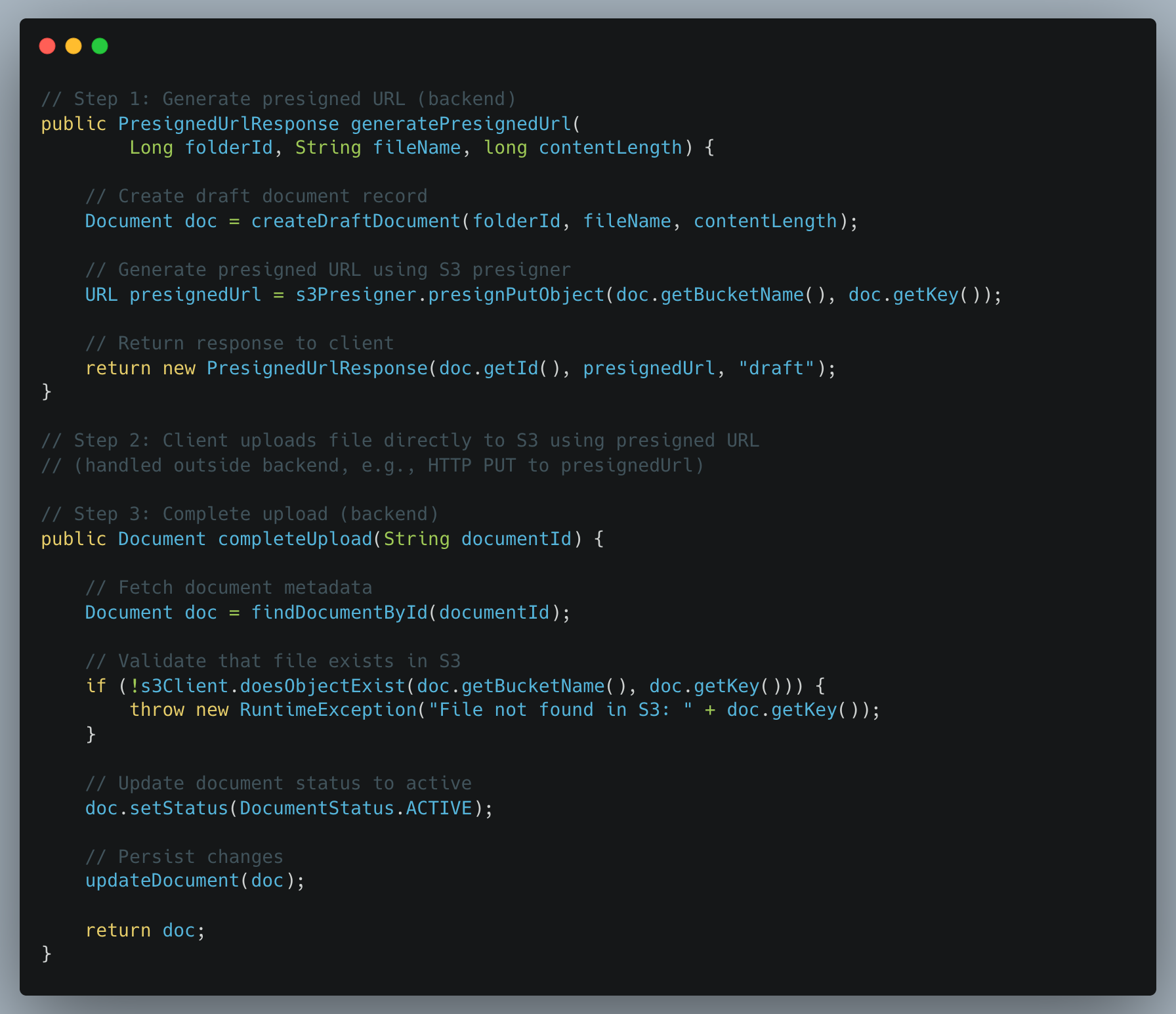 - Async, Scalable Uploads: Presigned URLs empower clients to upload directly to S3, reducing backend load while maintaining control and reliability.