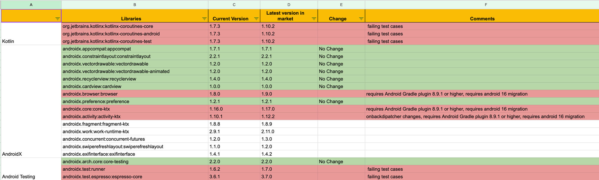 Problem: Manual, spreadsheet-driven library upgrades across many Android modules.
