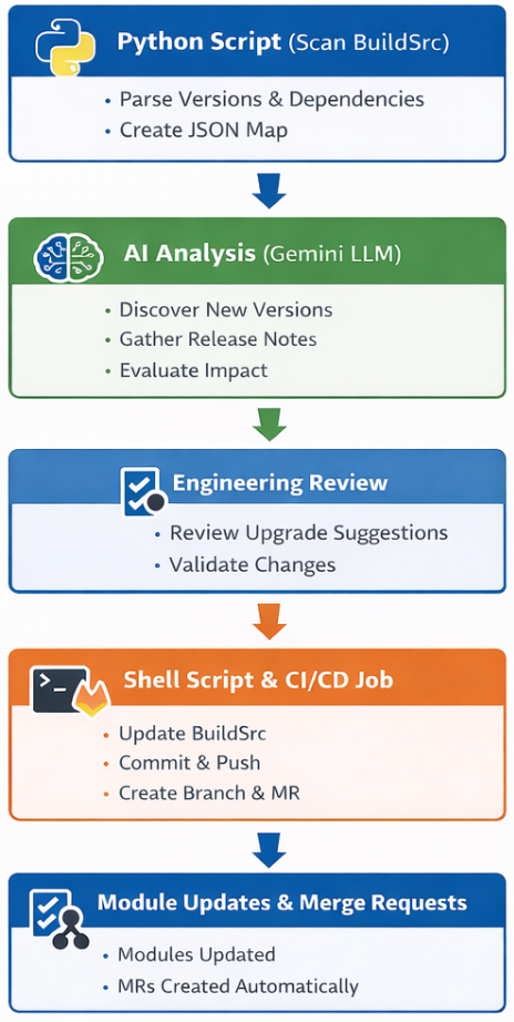 To streamline library upgrades and module updates, we designed an end-to-end automated pipeline that combines Python scripting, AI-assisted analysis, and CI/CD automation. The flow diagram below illustrates how dependency updates move from discovery to review and finally to propagation across modules.