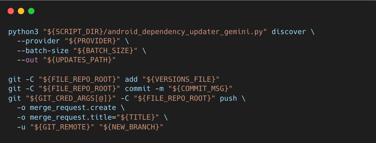 Versions.ktautomatically. - Pushes a branch and raises a Merge Request with all metadata, including: Current vs latest versions, Update reason, Size Impact, Evidence links (release notes, changelogs)