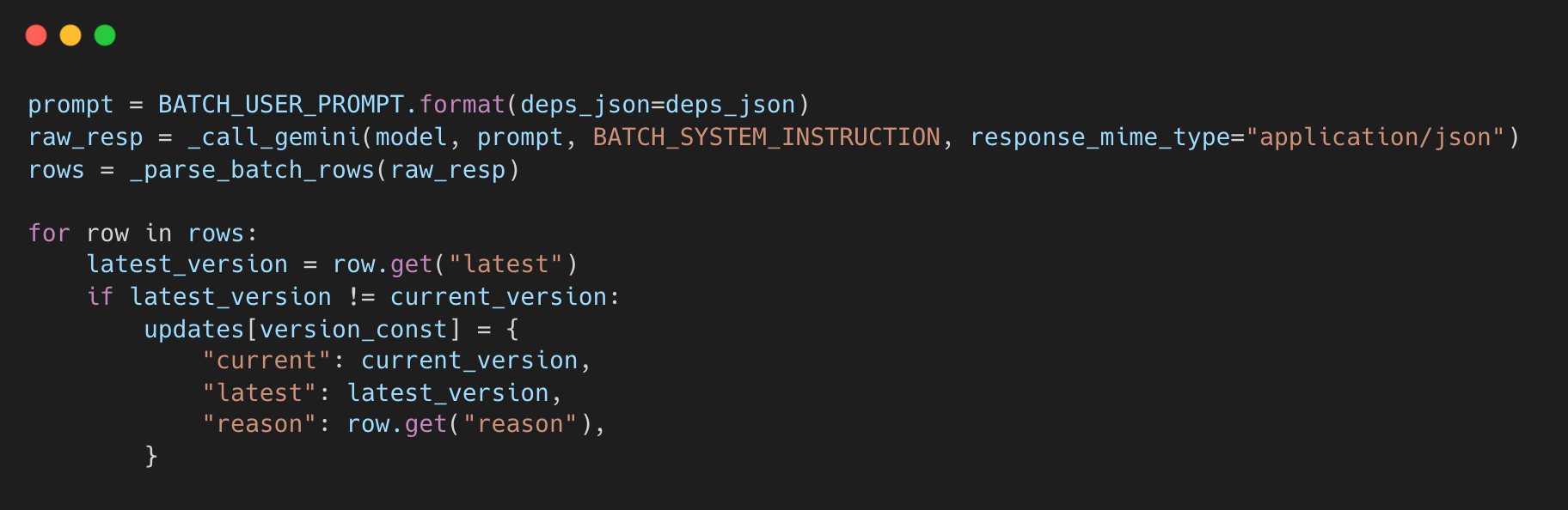 Gemini LLM in controlled batches—currently 5 dependencies per batch—ensuring efficient processing without overloading the model. - For each dependency, the LLM identifies: the latest stable version, an update recommendation (required vs optional) based on release notes and changelogs, and supporting evidence.