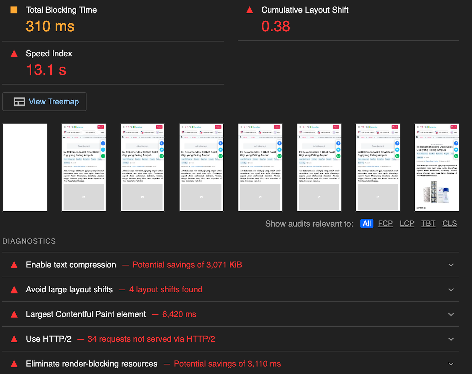 The individual Lighthouse report provides actionable diagnostics and recommendations to help identify the root cause of the CLS regression from the previous baseline of 0.1. In this case, Lighthouse flagged late-loading web fonts and image lazy-loading behaviour as contributors to the CLS spike.