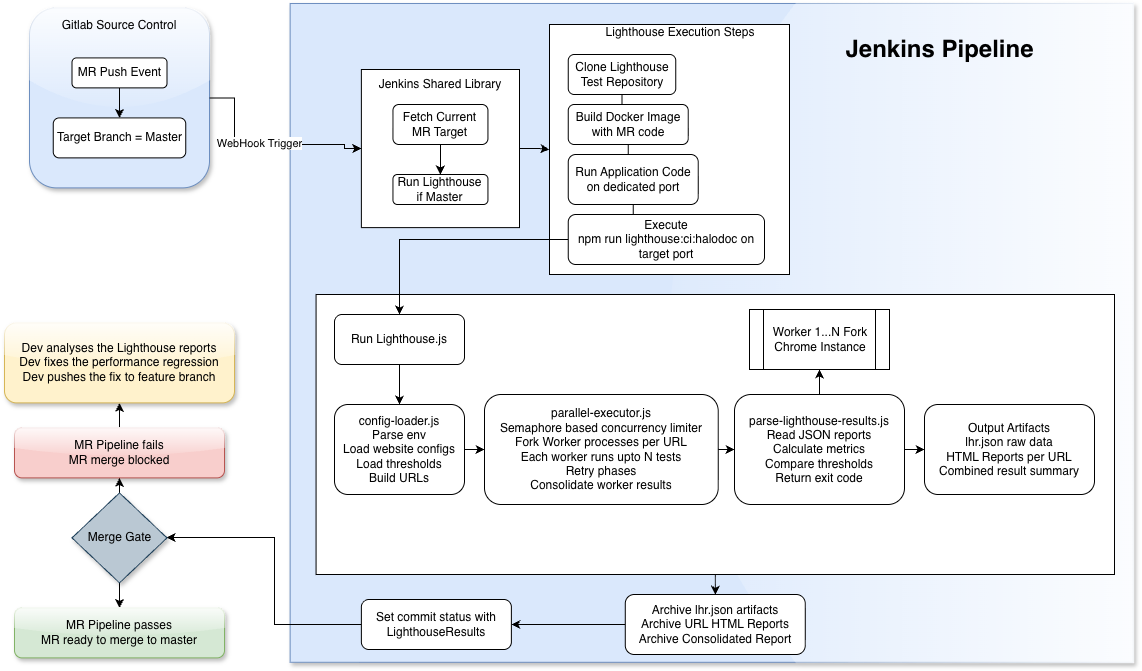 - However, using Lighthouse library programmatically via a test execution framework enabled parallel execution with isolated worker processes, allowing us to keep runtimes predictable while still running multiple iterations per URL. The additional orchestration complexity was an acceptable trade-off to make performance validation viable as a blocking pre-deployment check.