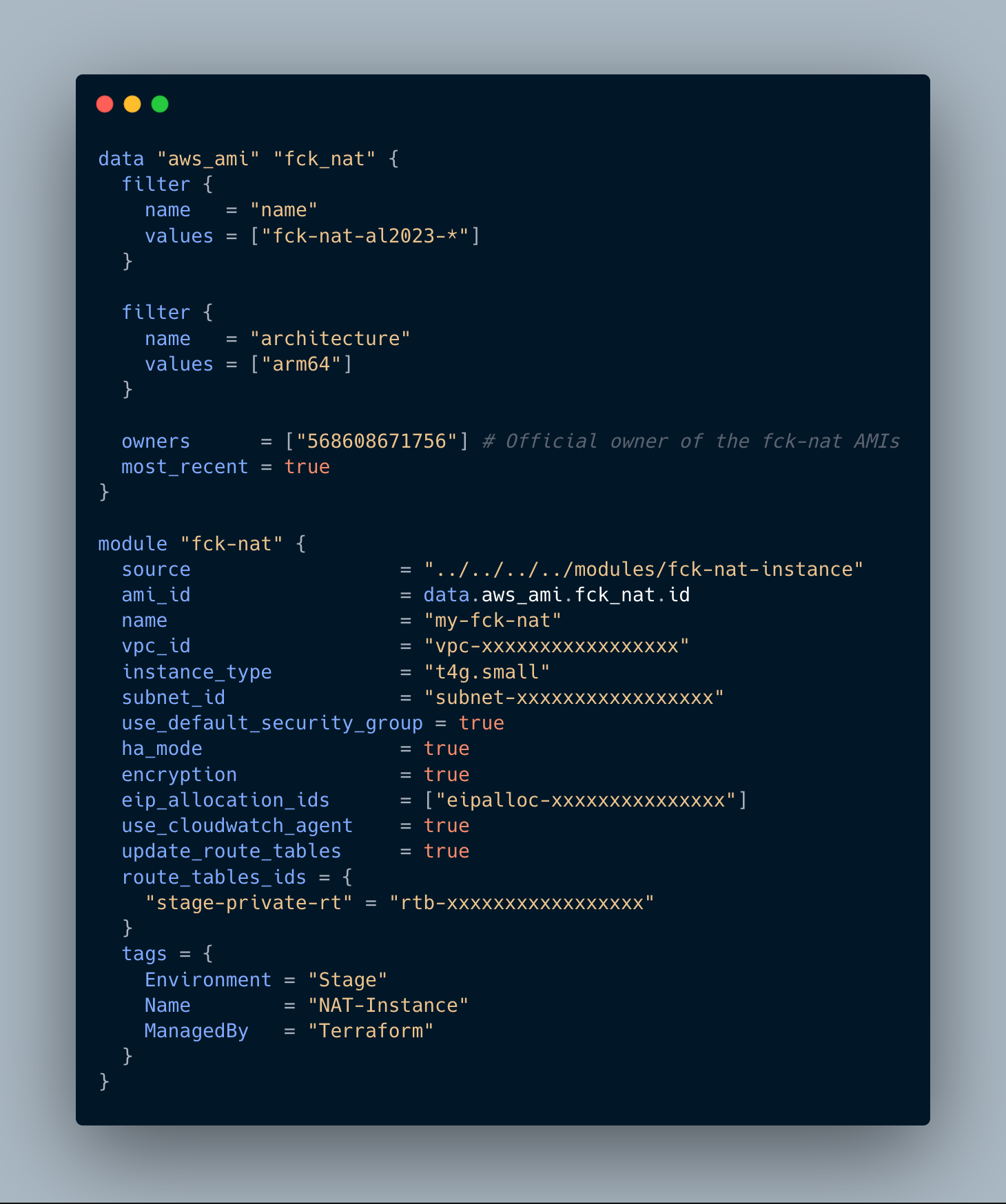 We adopted a well-maintained open-source module from terraform-aws-fck-nat, which provides a plug-and-play wrapper around the fck-nat AMI. This helped us avoid reinventing the wheel and allowed quick, consistent provisioning of NAT instances across environments.