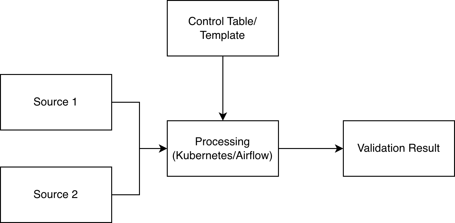 The validation pipeline is designed to be source-agnostic and configuration-driven. Multiple source systems (Source 1, Source 2) feed data into a centralized processing hub. Rather than hardcoding validation logic per pipeline, all rules and execution parameters are defined in a Control Table / Template.