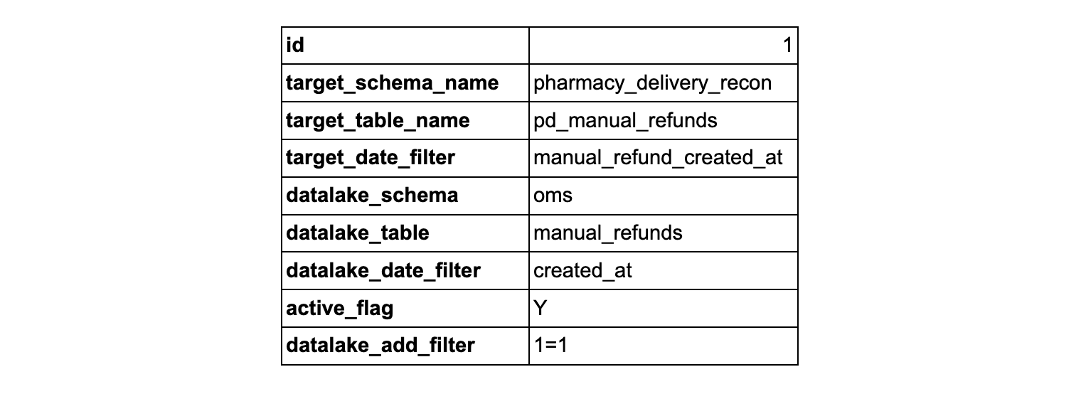 Since schemas often differ between our Data Lake and operational databases, direct comparison isn't straightforward. To address this, we rely on a configuration-driven Mapping Table that defines the relationships between source and target columns. The pipeline uses this map to dynamically generate validation queries, comparing the Processed Zone S3 source against the Amazon RDS target. Any batch where the values diverge beyond an acceptable threshold is immediately flagged for review. Below is the example of Control Table Configuration