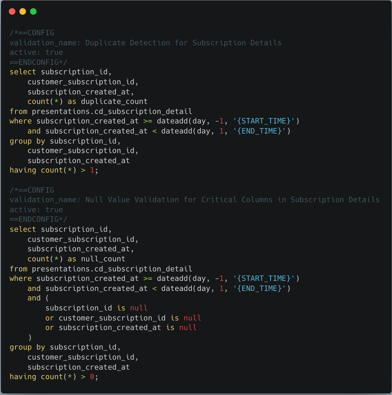 To support this, the same validation logic is executed against multiple engines (Athena and Redshift), and the results are compared. AI analyzes the transformation SQL to generate baseline validation queries automatically, while engineers review and approve them before execution. Below is an example of a validation query.