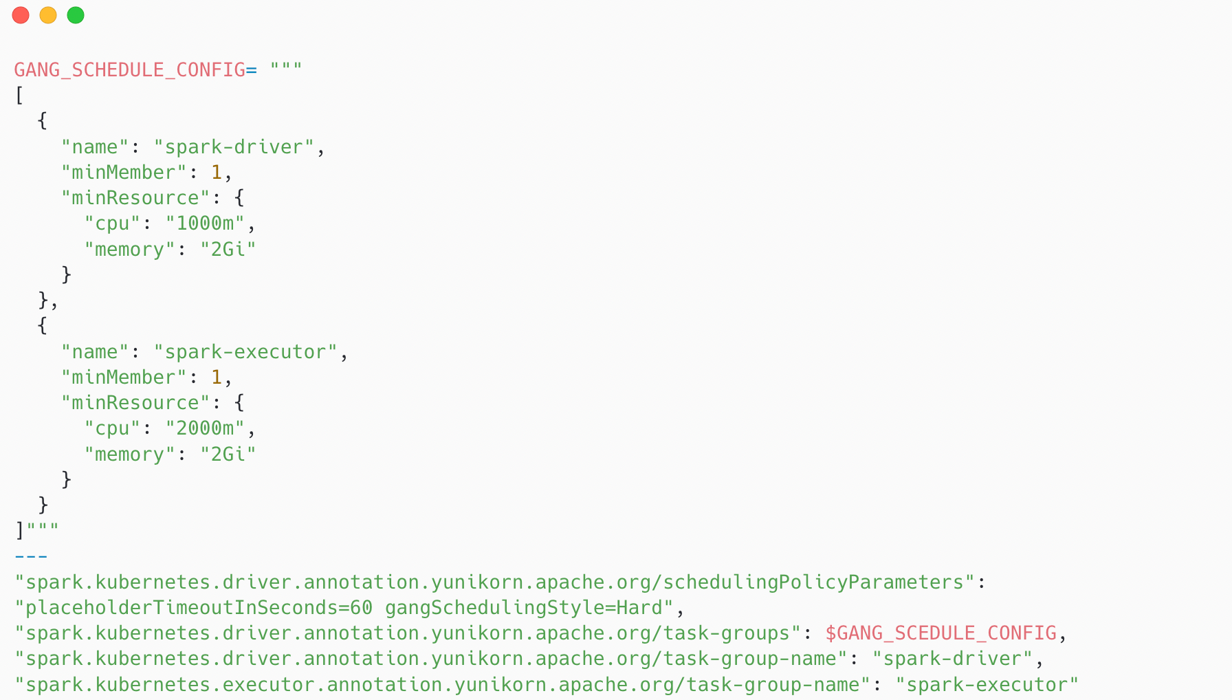 In practice, enabling this required us to define a task group as part of the Spark job submission. The task group specifies how many pods belong to the application and what resources they collectively require. The resource definitions in the task group needed to align precisely with the actual Spark configuration, including driver and executor CPU and memory requests