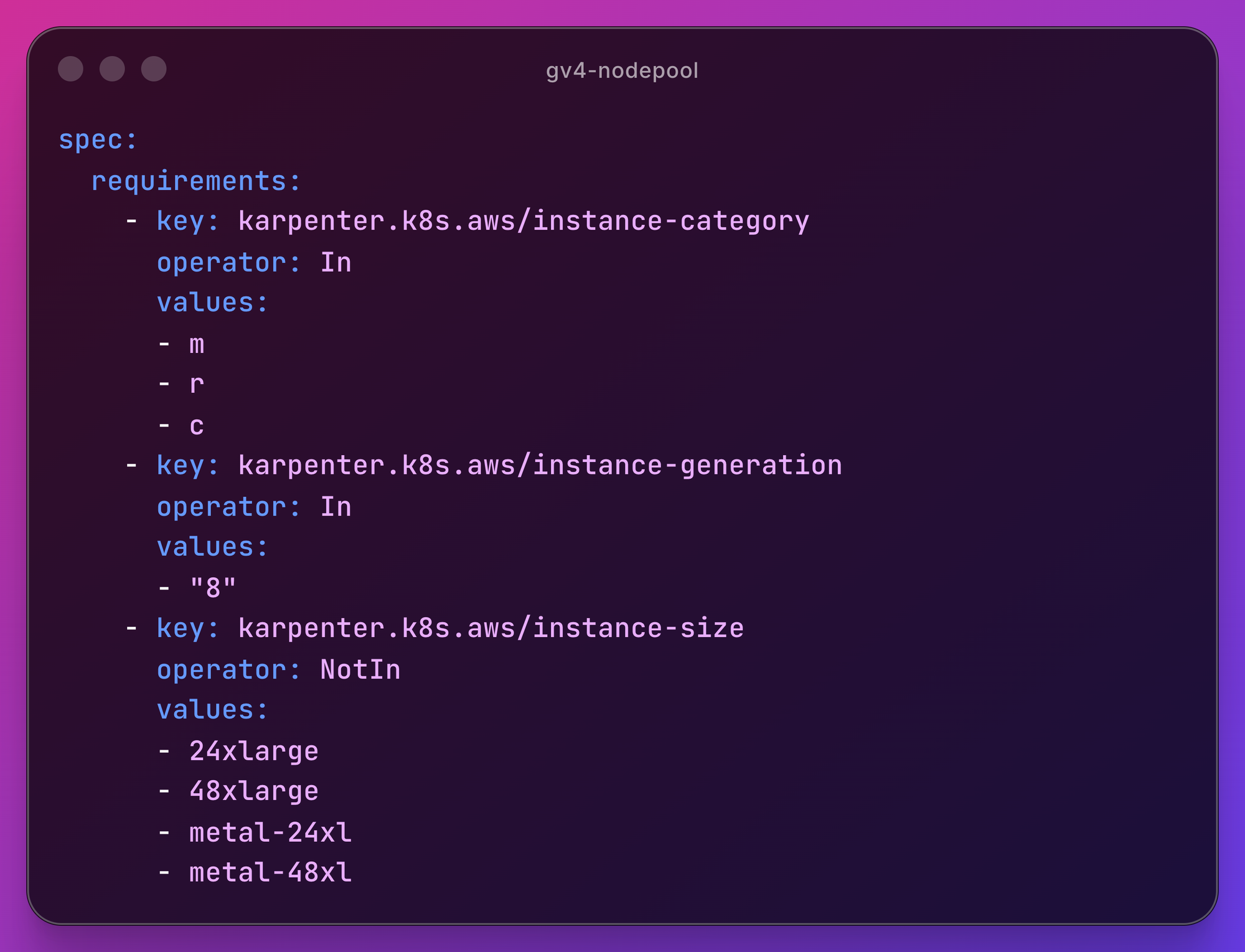 To improve efficiency, we intentionally excluded very large instance types (e.g., 24xlarge, 48xlarge), which helped us avoid underutilization caused by oversized nodes and enabled more predictable autoscaling and faster scale-downs.