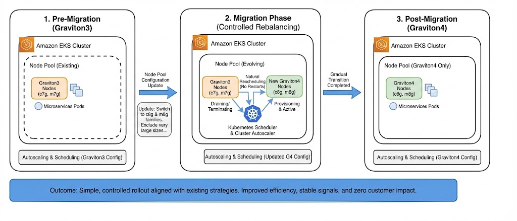 We migrated to Graviton4 by evolving our existing EKS node pools, rather than introducing parallel or shadow pools. This approach kept the rollout simple, low-risk, and fully aligned with our existing autoscaling and scheduling model.