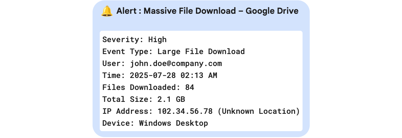 Google Drive is essential for collaboration but poses a risk for data exfiltration, especially from insiders or compromised accounts. Large or unusual downloads can go unnoticed without monitoring. To reduce this risk, Halodoc’s security team actively tracks such activities as part of our data protection strategy.