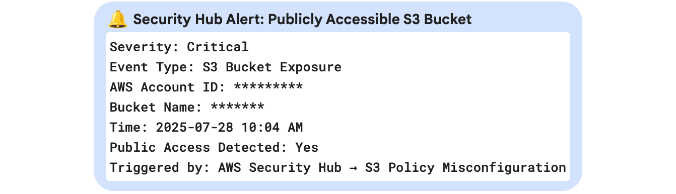 Amazon S3 buckets are widely used to store business data, but if misconfigured, they may be unintentionally exposed to the internet. This can lead to sensitive files being publicly accessible. To prevent this, we actively monitor security alerts from AWS Security Hub, which consolidates findings from services like S3, GuardDuty, Config, and more.