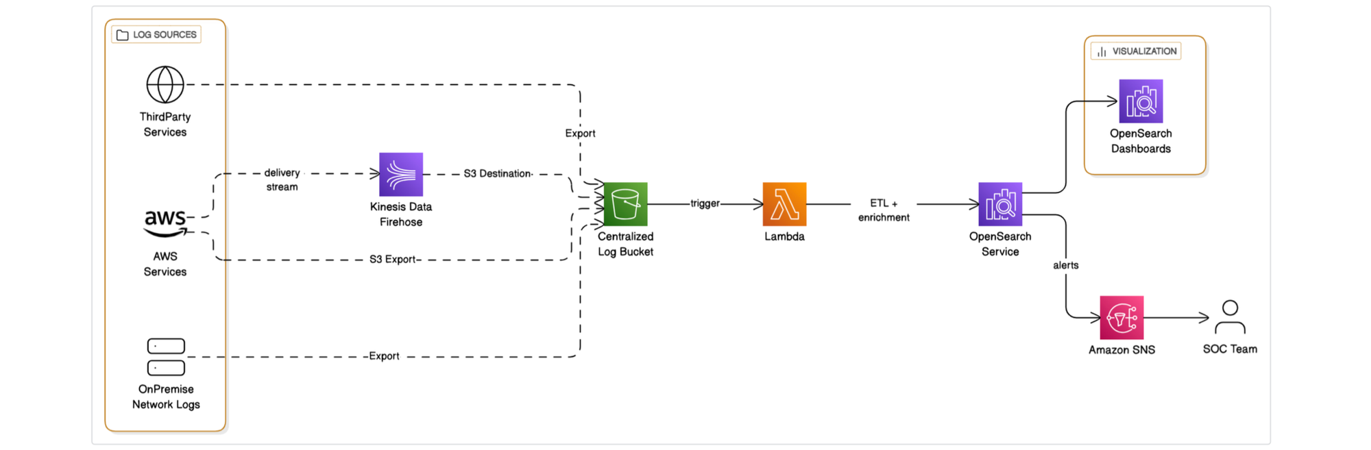Logs from AWS services (like GuardDuty, CloudTrail), on-prem servers, and third-party tools are sent to a central S3 bucket. AWS logs are delivered via Kinesis Firehose or directly from services. Other systems use agents like FluentD to send logs.