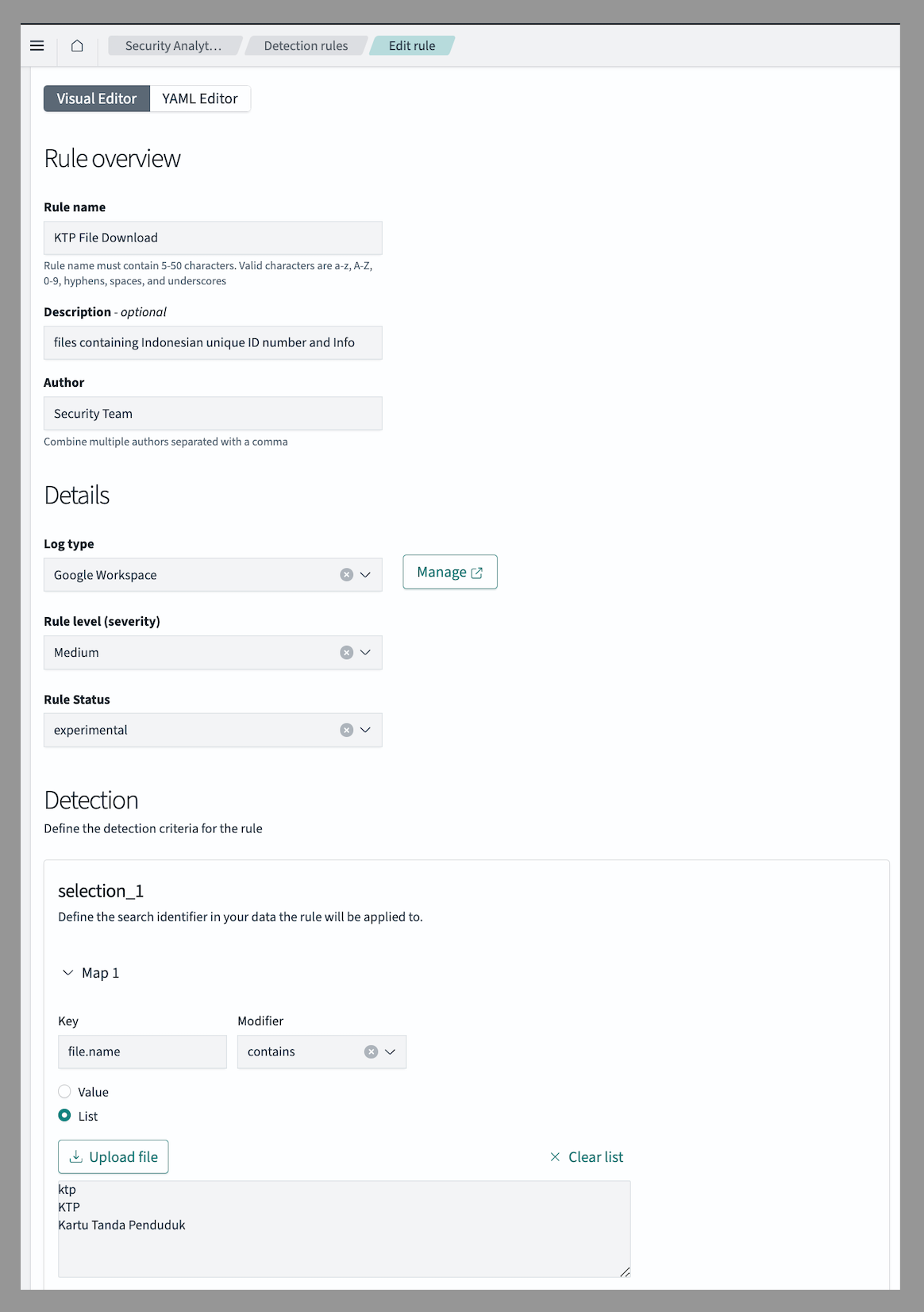 Here is a sample detection rule to detect file downloads from Google Workspace that contain Indonesian identity information, such as KTP (Kartu Tanda Penduduk):