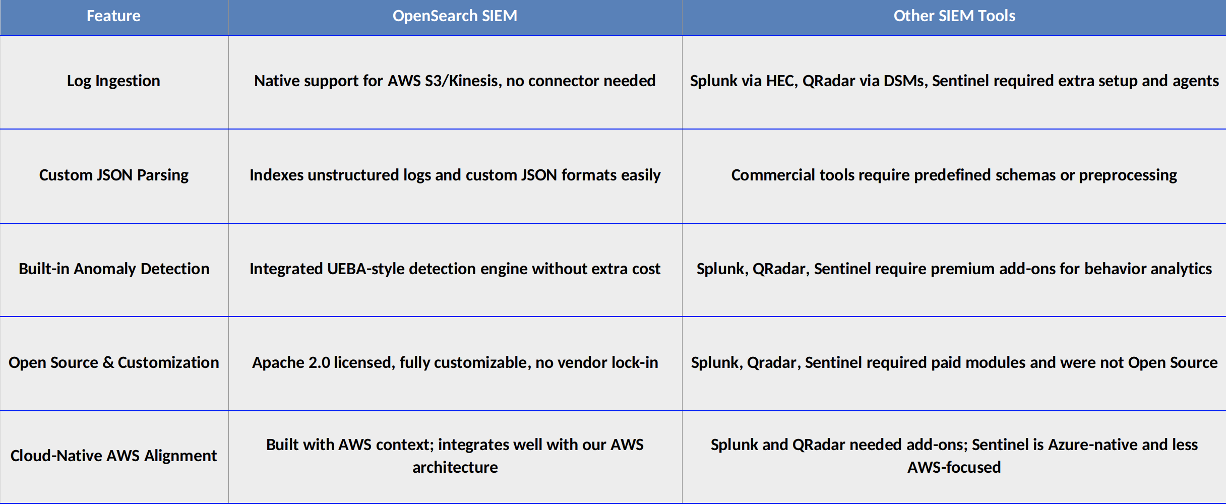 Most commercial SIEMs charge based on how much data you send. OpenSearch is open source, so we avoided high licensing costs while still getting advanced features like dashboards, search, and detection.