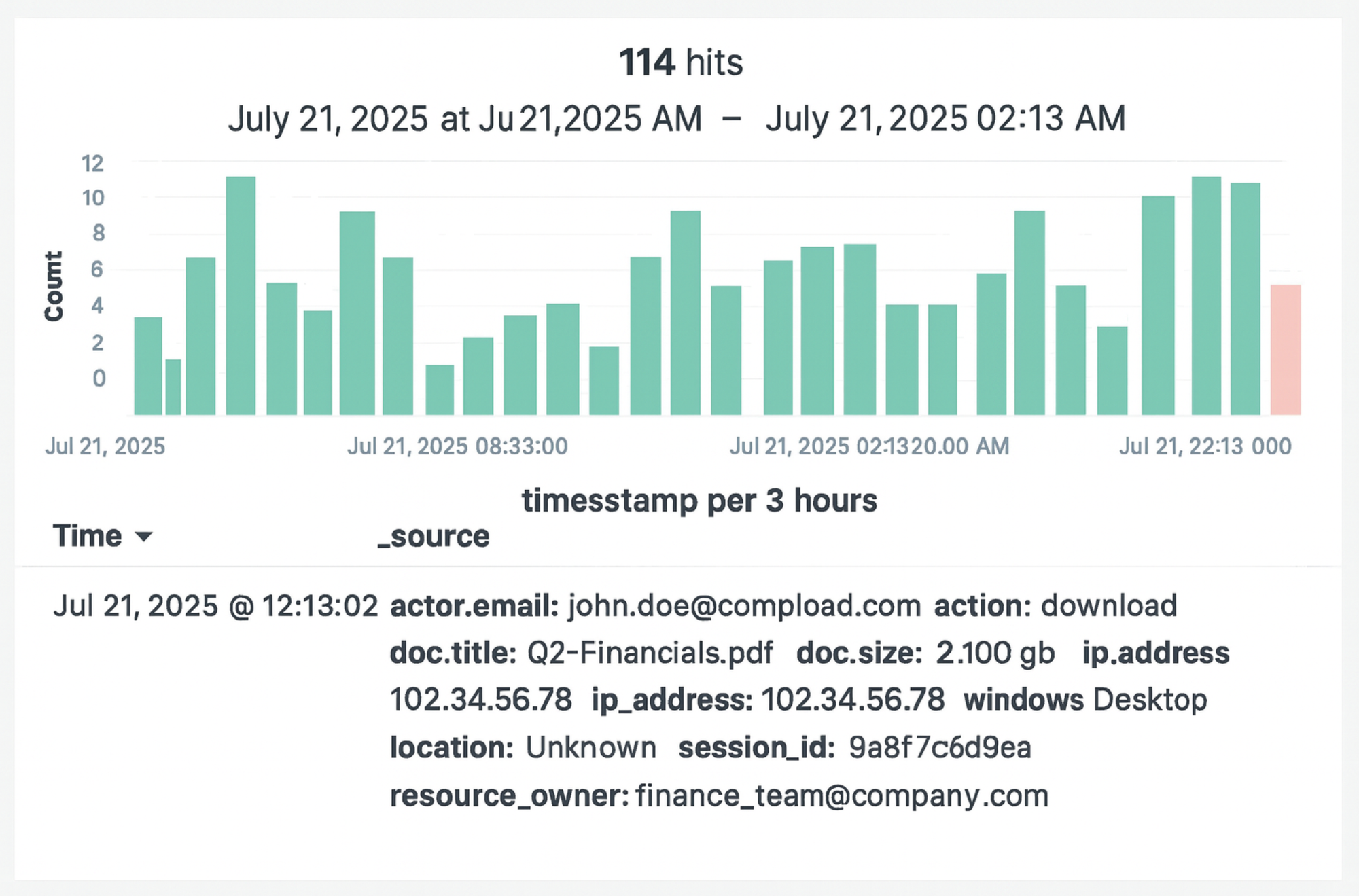 We regularly collect Google Drive audit logs into our OpenSearch-based SIEM system. These logs provide important details like: