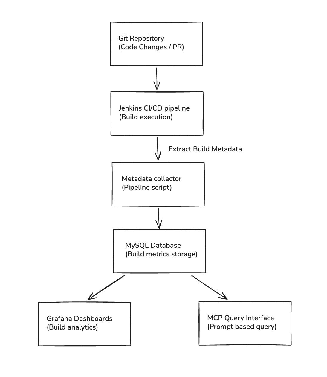The architecture was intentionally designed to remain lightweight and non-intrusive to existing pipelines. Instead of introducing new CI tooling or complex observability, we extended the existing Jenkins workflow to export structured build metadata after every execution. This ensured minimal operational overhead while enabling full visibility into build activity across the platform.